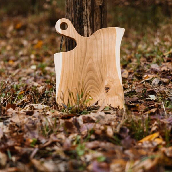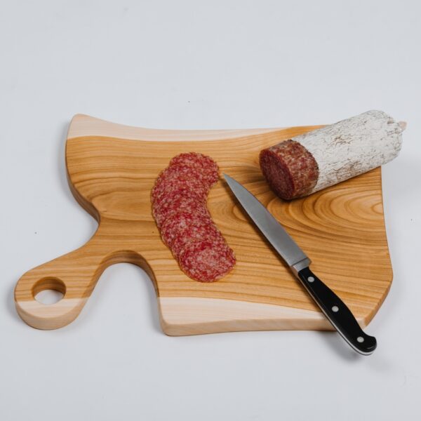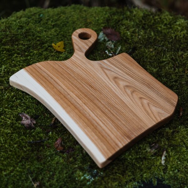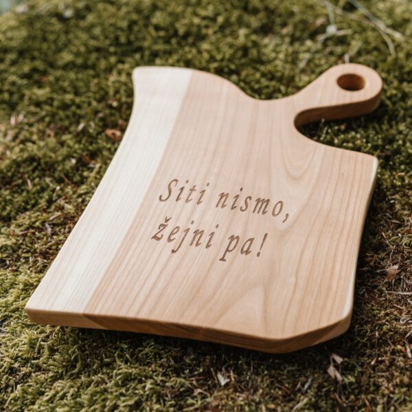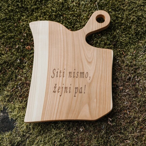 Deska za rezanje mer 18,5 cm x 37 cm, je izdelana iz trajnostno pridobljenega češnjevega ali brestovega lesa, ki zagotavlja naravno vzdržljivost in eleganco. Njena velika površina je idealna za obdelavo širokega spektra živil, od sveže zelenjave do kruha in sira, medtem ko je njena oblika z gladkimi robovi in praktičnim ročajem oblikovana za estetiko in udobje pri rokovanju. Ta deska ni samo uporabna kuhinjska oprema, temveč tudi privlačen kos, ki se bo lepo podal v vsako kuhinjsko okolje.